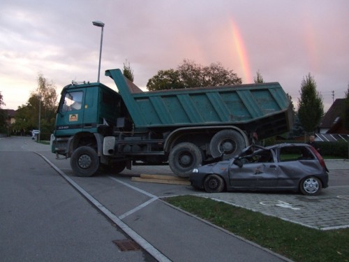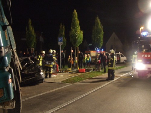 Übungsszenario war technische Hilfeleistung bei einem Verkehrsunfall mit "mehreren eingeklemmten Personen". Den zahreich erschienen Zuschauern bot sich ein eindruckvolles Bild. Ein PKW mit 2 verletzten Personen war unter einem LKW eingeklemmt sowie ein zweiter PKW mit einer eingeklemmten Person.