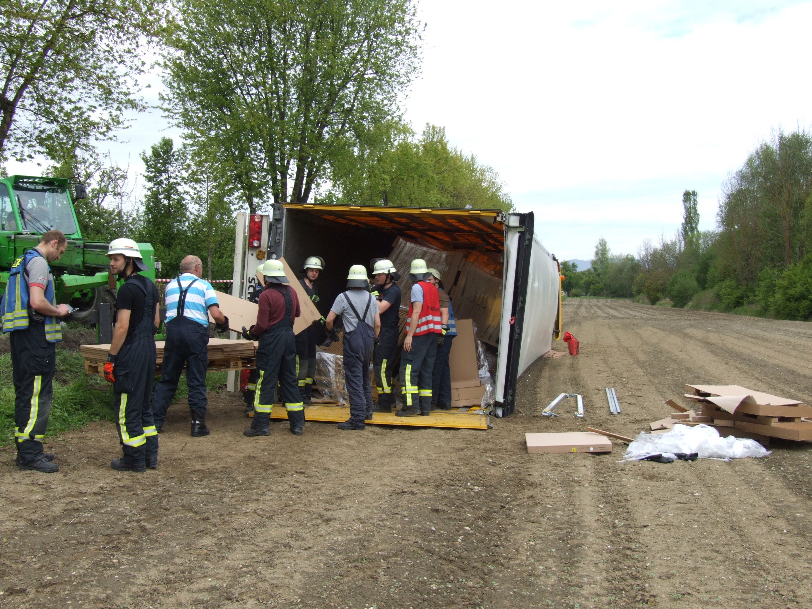 Ein Sattelzug kam am Samstag Vormittag auf der Stefansfelder Straße in Fahrtrichtung Stefansfeld mit der rechten Fahrzeugseite auf das unbefestigte Bankett der Fahrbahn. Dabei verlor der Fahrer die Kontrolle über den LKW. Zugmaschine und Auflieger kippten um und lagen beim Eintreffen des ersten Fahrzeugs auf der rechten Seite im einen Meter tiefer liegenden Feld. Die Fahrzeugbesatzung konnte sich unverletzt aus dem Fahrerhaus befreien.