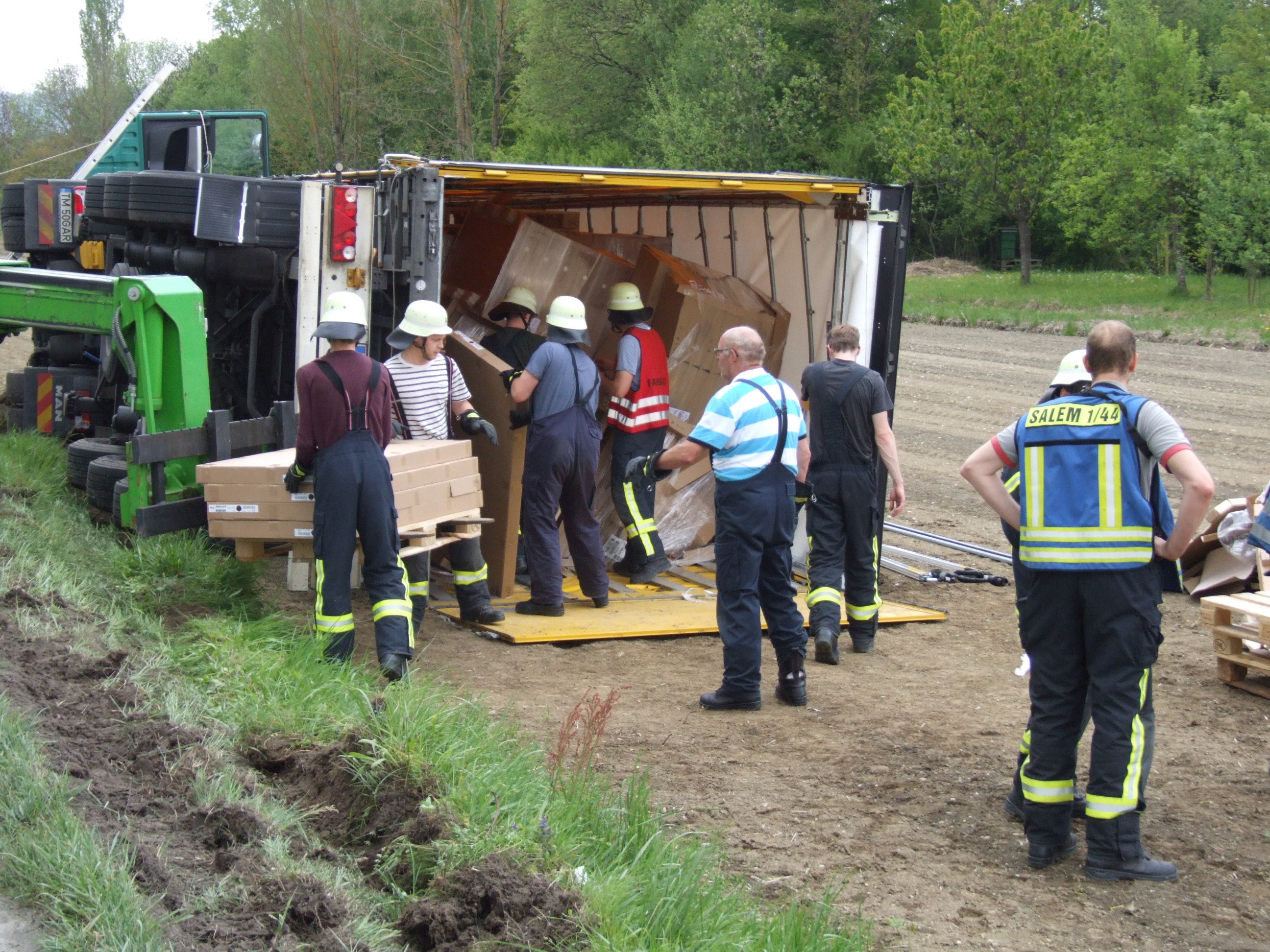 Die Erkundung ergab, dass der Auflieger voll beladen mit einer Lieferung für eine große Möbelhauskette war. Um das Fahrzeug wieder aufrichten zu können, musste der Auflieger komplett entladen werden. Dies konnte nur von Hand erfolgen, weshalb sich der Einsatz mehrere Stunden hinzog. Unterstützt bei der Bergung wurde die Kräfte durch ortsansässige Firmen, welche Stapler, Paletten und LKW mit Anhänger zur Verfügung stellten um die Ladung zu bergen. Gegegn 17:00 Uhr konnten dann Mitarbeiter der Salemer Firma Härter die Bergung des Sattelzugs durchführen. Hierfür wurde eine provisorische Rampe errichtet und Zugmaschine mit Auflieger mit einem 90 Tonnen Kran aufgerichtet. Schliesslich musste ein Teil des Erdreiches abgetragen werden, da aus dem Tank des Unfalllasters größere Mengen Diesel ins Feld liefen. | ||