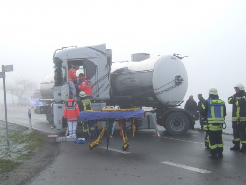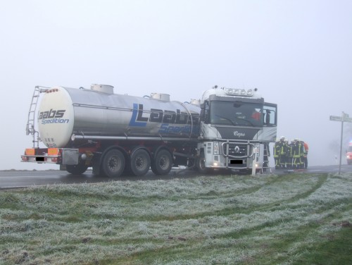 Dichter Nebel und Temperaturen um den Gefrierpunkt dürften heute Vormittag mit ursächlich für einen Verkehrsunfall auf der L200a kurz vor Tüfingen gewesen sein. Ein Tanksattelzug kam nach einer scharfen Rechtskurve ins Schleudern, woraufhin die Zugmaschine einknickte und um 180° gedreht zum Stehen kam.