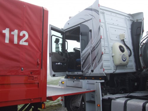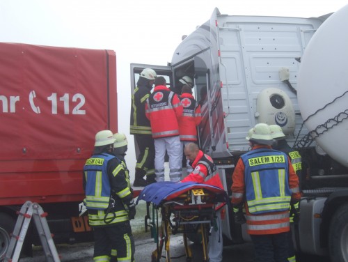 Der Fahrer des LKW erlitt durch das Bremsmanöver starke Prellungen im Brustbereich und musste notärztlich versorgt werden. Auf Grund der Verletzungen entschied sich der Rettungsdienst zu einer schonenden Rettung durch die Feuerwehr. Hierzu wurde der GW-T zur Einsatzstelle gerufen. Über die Ladebordwand des GW-T wurde der Fahrer dann schonend aus der Fahrerkabine gerettet und an den Rettungsdienst übergeben. Währende der Zeit der Rettung wurde der Verletzte permanent durch den Rettungsdienst betreut, was auf Grund der Größe der Ladebordwand problemlos möglich war. Während der Zeit der Rettung und anschließenden Bergung des Gespanns war die L200a voll gesperrt. Der Verkehr wurde örtlich durch die Landespolizei umgeleitet. Vor Ort war die Feuerwehr Salem mit 28 Einsatzkräften und 6 Fahrzeugen im Einsatz. Weitere Kräfte vor Ort: Rettungsdienst, Landespolizei Ba-Wü, Bergungsunternehmen | ||
