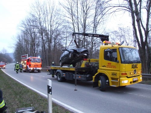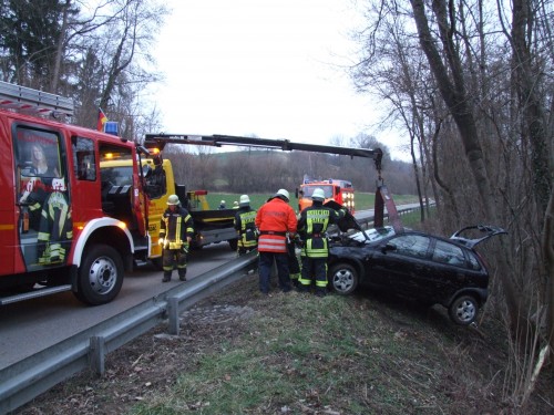 Weildorf zu einem Verkehrsunfall kurz nach dem Hof Schapbuch alarmiert. Der PKW einer jungen Dame kam aus ungeklärter Ursache nach rechts von der Fahrbahn ab, prallte dort gegen einen Baum, drehte sich um 90° und kam dann ca. 8m unterhalb der Straße kurz vor einem Bach zum Stehen. Entgegen der Meldung hatte sich der PKW jedoch nicht überschlagen. Beim Eintreffen der Feuerwehr wurde die junge Dame bereits durch den Rettungsdienst versorgt und zur weiteren Behandlung in ein Krankenhaus transportiert. Die Aufgabe der Feuerwehr bestand darin, austretende Bertriebsstoffe aus dem PKW aufzunehmen und diesen dann mit der Seilwinde des Rüstwagens zurück auf die Straße zu ziehen, so dass er vom Abschleppdienst aufgenommen werden konnte. Nachdem dies erfolgreich erledigt war, konnten die eingesetzten Kräfte der Feuerwehr die Einsatzstelle an die Landespolizei übergeben und von dieser abrücken. | ||