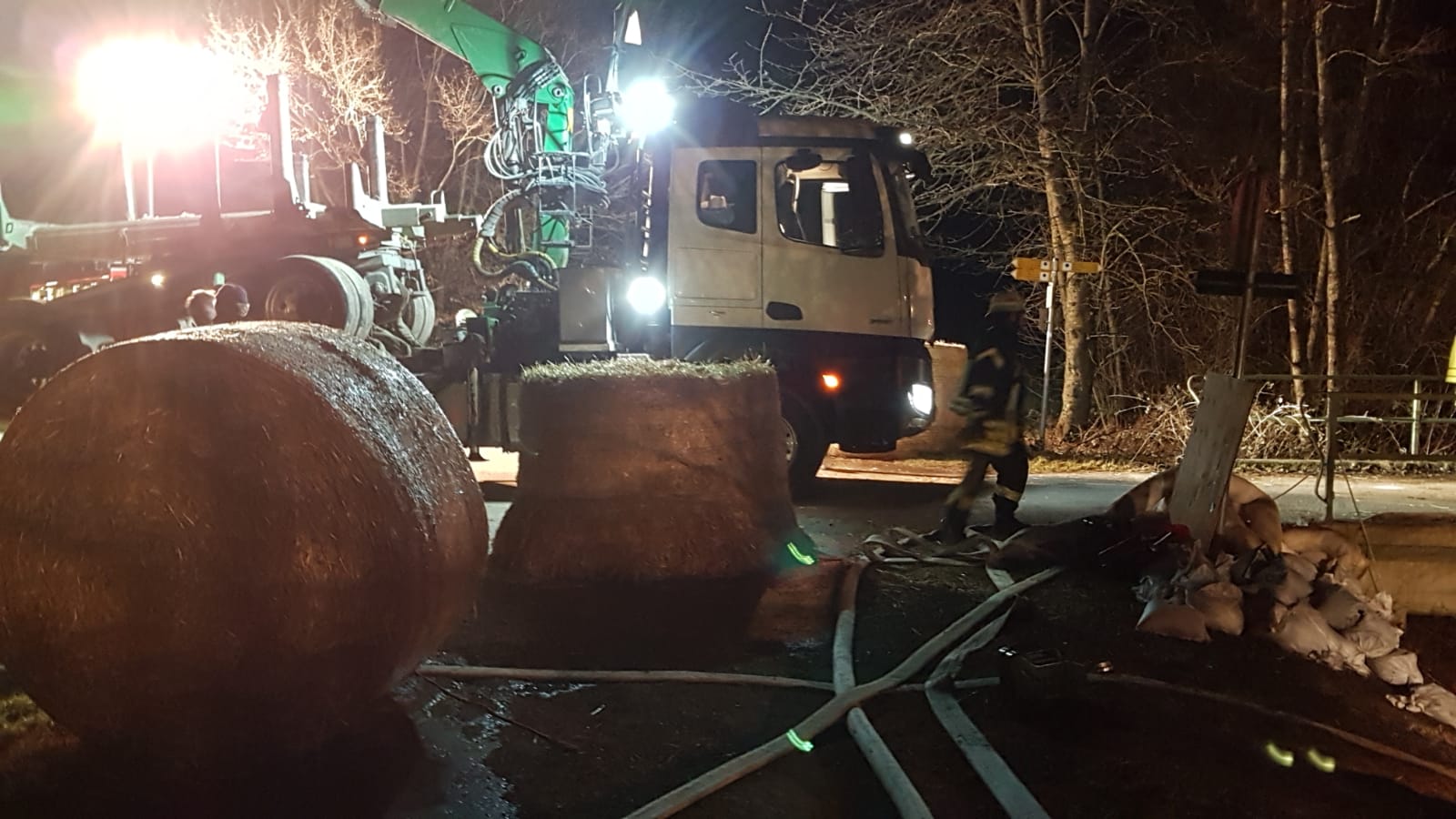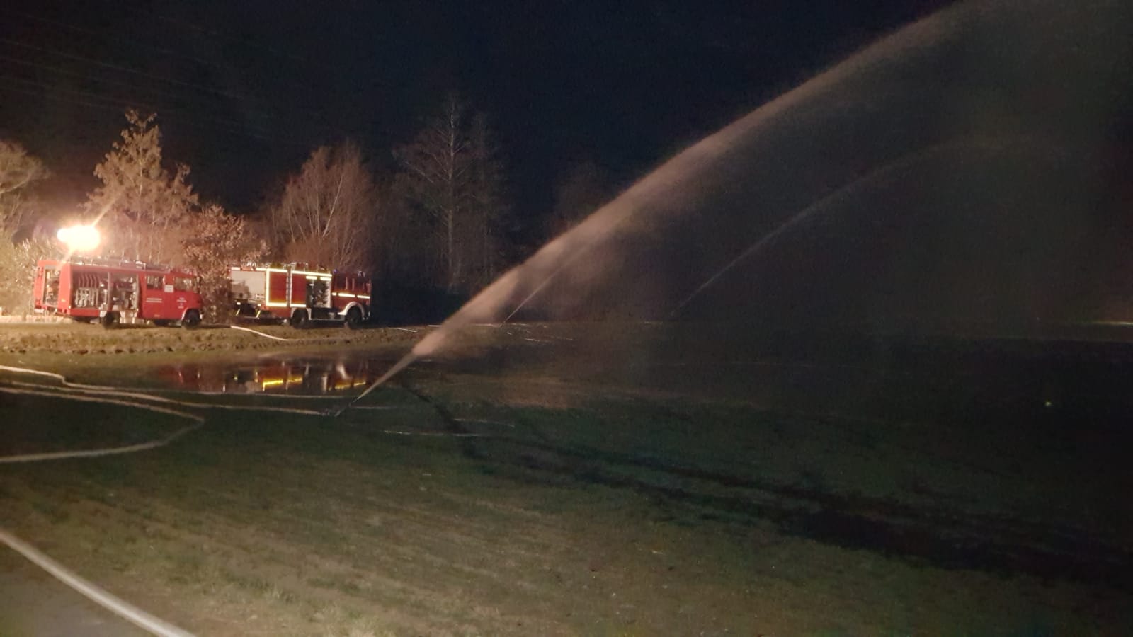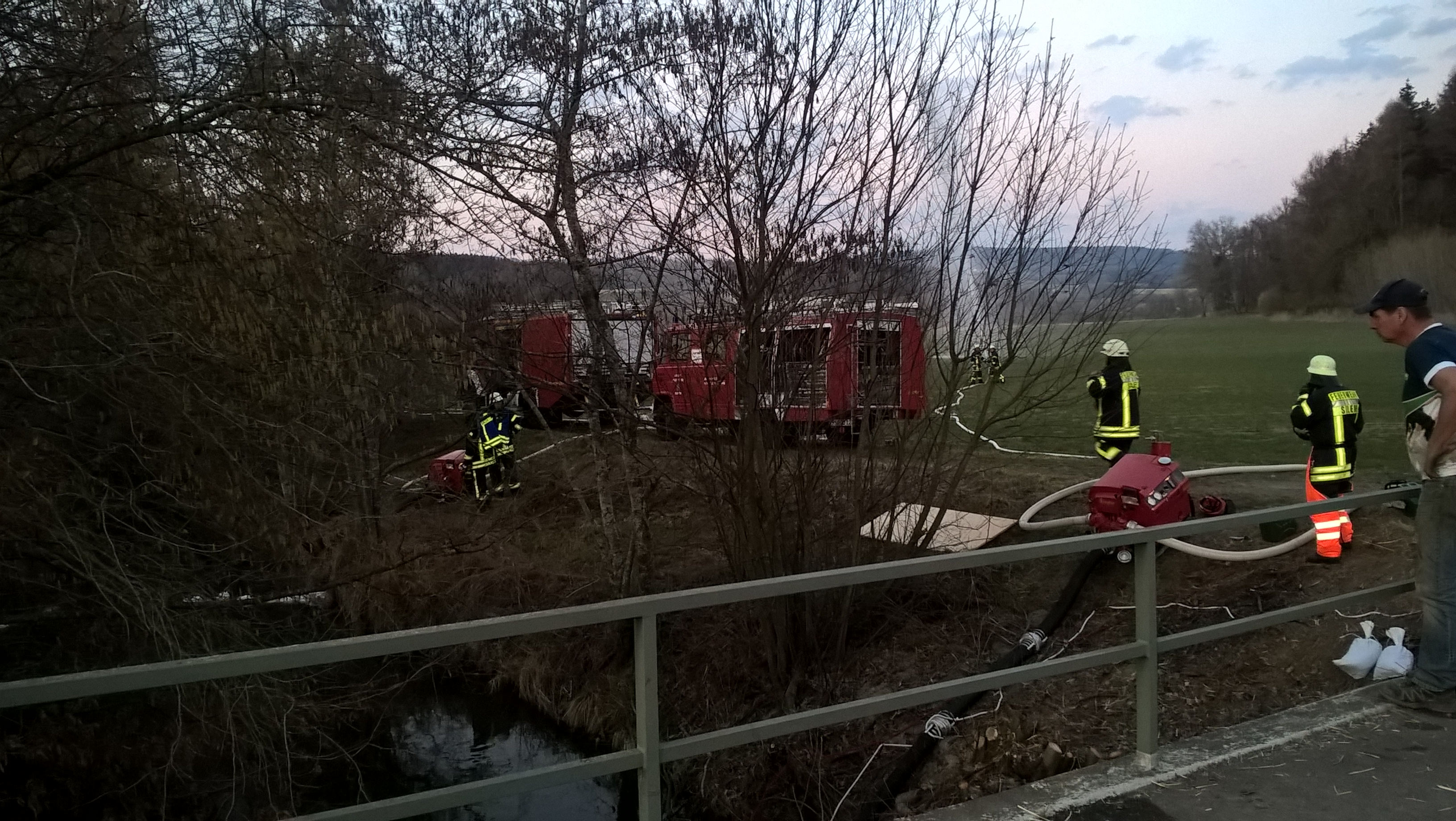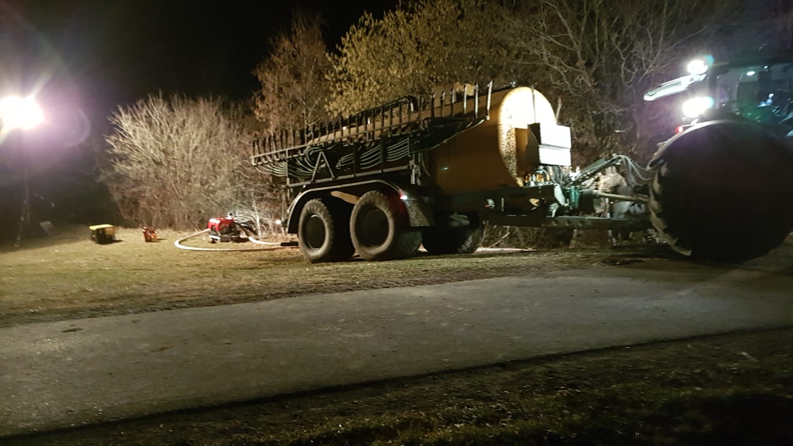 Deggenhausertal waren mehrere 1000 Liter Gülle in die Aach geflossen. Gegen 17:45 erreichte die Wasserverunreinigung die Brücke am Fischerhaus auf der Gemarkung Neufrach. Hier hatten die Einsatzkräfte bereits mehrere Pumpen in Stellung gebracht. Unterstützung kam vom THW Überlingen mit einer Großpumpe und einem Landwirt mit zwei Pumpfässern. Durch diese Maßnahmen wurden in der Minute 12.000 Liter Wasser/Güllegemisch aus der Deggenhauser Aach abgepumpt und auf umliegenden Felder ausgebracht. Gegen 21:00 Uhr konnte der Einsatzleiter feststellen, dass keine Gülle mehr im Bachwasser heranfloss, so dass die Pumparbeiten eingestellt werden konnten. Umfangreiche Aufräum- und Reinigungsarbeiten schlossen sich an. Unter Anderem kam ein Holztransportfahrzeug mit Kran zum Einsatz, um Heurundballen aus der Aach zu bergen, welche zuvor zum Aufstauen des Bachs von den Einsatzkräften eingebracht wurden. Gegen 23:30 Uhr war die Feuerwehr Salem wieder einsatzbereit. | ||
