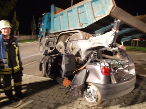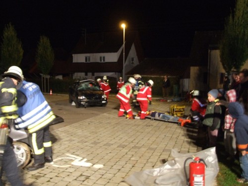 Übungsszenario war technische Hilfeleistung bei einem Verkehrsunfall mit "mehreren eingeklemmten Personen". Den zahreich erschienen Zuschauern bot sich ein eindruckvolles Bild. Ein PKW mit 2 verletzten Personen war unter einem LKW eingeklemmt sowie ein zweiter PKW mit einer eingeklemmten Person.