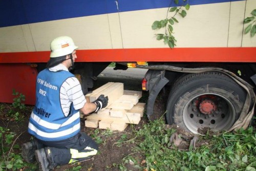 Zu einem nicht alltäglichen Einsatz wurde die Feuerwehr Salem von der Landespolizei über die Integrierte Feuerwehr- und Rettungsleitstelle am Freitagmorgen gerufen. Ein LKW soll sich auf der Zufahrt zur Autobahn auf dem Zubringerweg zum Tobelhof festgefahren haben und würde weder durch ein Abschleppunternehmen noch sonst was wieder frei kommen.