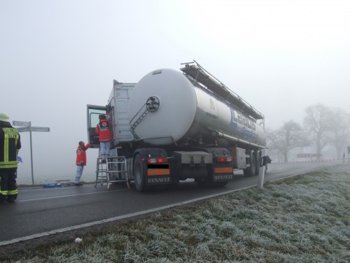 Dichter Nebel und Temperaturen um den Gefrierpunkt dürften heute Vormittag mit ursächlich für einen Verkehrsunfall auf der L200a kurz vor Tüfingen gewesen sein. Ein Tanksattelzug kam nach einer scharfen Rechtskurve ins Schleudern, woraufhin die Zugmaschine einknickte und um 180° gedreht zum Stehen kam.