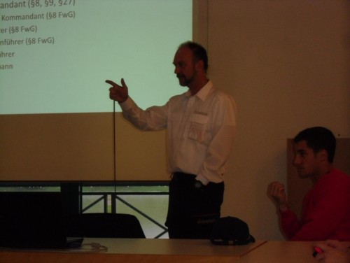Bevor aber dieser als Überraschung geplante Löscheinsatz um Mitternacht stattfinden kann, sitzen zwölf Jugendliche schon ab 08:30 Uhr im theoretischen Unterricht im großen Lehrsaal des Gerätehauses.