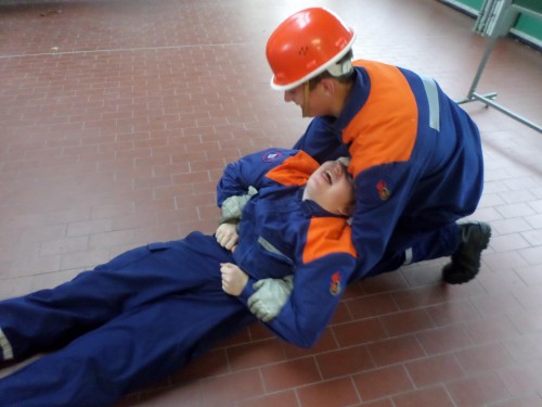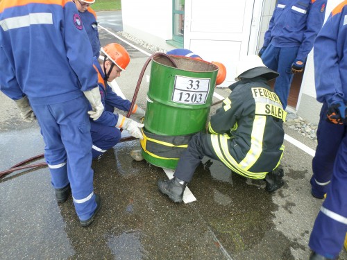 Im Lauf des Tages wird die Theorie auch in die Praxis umgesetzt. Anleitern am Gerätehaus, Saugleitungen kuppeln, Abdichten eines undichten Fasses. Die Ausbildungsinhalte vermitteln Feuerwehrleute aus dem aktiven feuerwehrtechnischen Dienst, somit bekommt das Ganze noch einen realen Praxisbezug, da Einsatzerfahrung in die Themen mit einfließt.