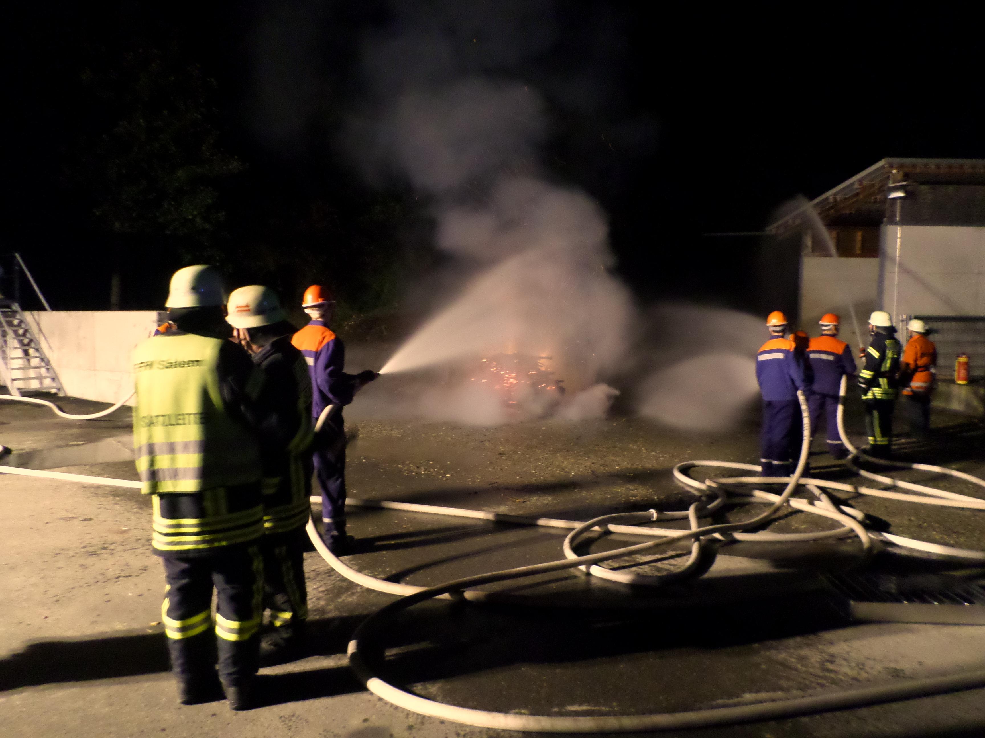 Ein vorbereiteter Kleinbrand auf dem Bauhofgelände Salem, beaufsichtigt durch die Gruppenleiter der Jugendfeuerwehr, muss schnellst möglichst gelöscht werden.