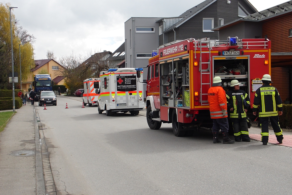 Zu einem Wohnungsbrand in der Bahnhofstraße wurde die Feuerwehr Salem am Freitagmorgen um 11:05 alarmiert. Der Anrufer meldete bei der Leitstelle Bodensee-Oberschwaben ein brennendes Fernsehgerät. Beim Eintreffen der ersten Kräfte hatte sich der Brand auf das gesamte Zimmer ausgebreitet. Mit 2-C Rohren und 3 Atemschutztrupps konnte die Feuerwehr bereits 10 Minuten nach dem Eintreffen "Feuer aus" melden. Die Nachlöscharbeiten und Lüftungsmaßnahmen zogen sich allerdings noch einige Zeit hin. Drei Bewohner konnten sich noch vor dem Eintreffen der Feuerwehr in Sicherheit bringen. Sie wurden vom DRK betreut und mit Verdacht auf Rauchvergiftung ins Krankenhaus gebracht. Neben dem Regelrettungsdienst war auch die SEG Salemertal vor Ort im Einsatz. Beamte der Landespolizei nahmen weitere Ermittlungen auf. Während des Löscharbeiten musste die Bahnhofstraße für den Verkehr komplett gesperrt werden.